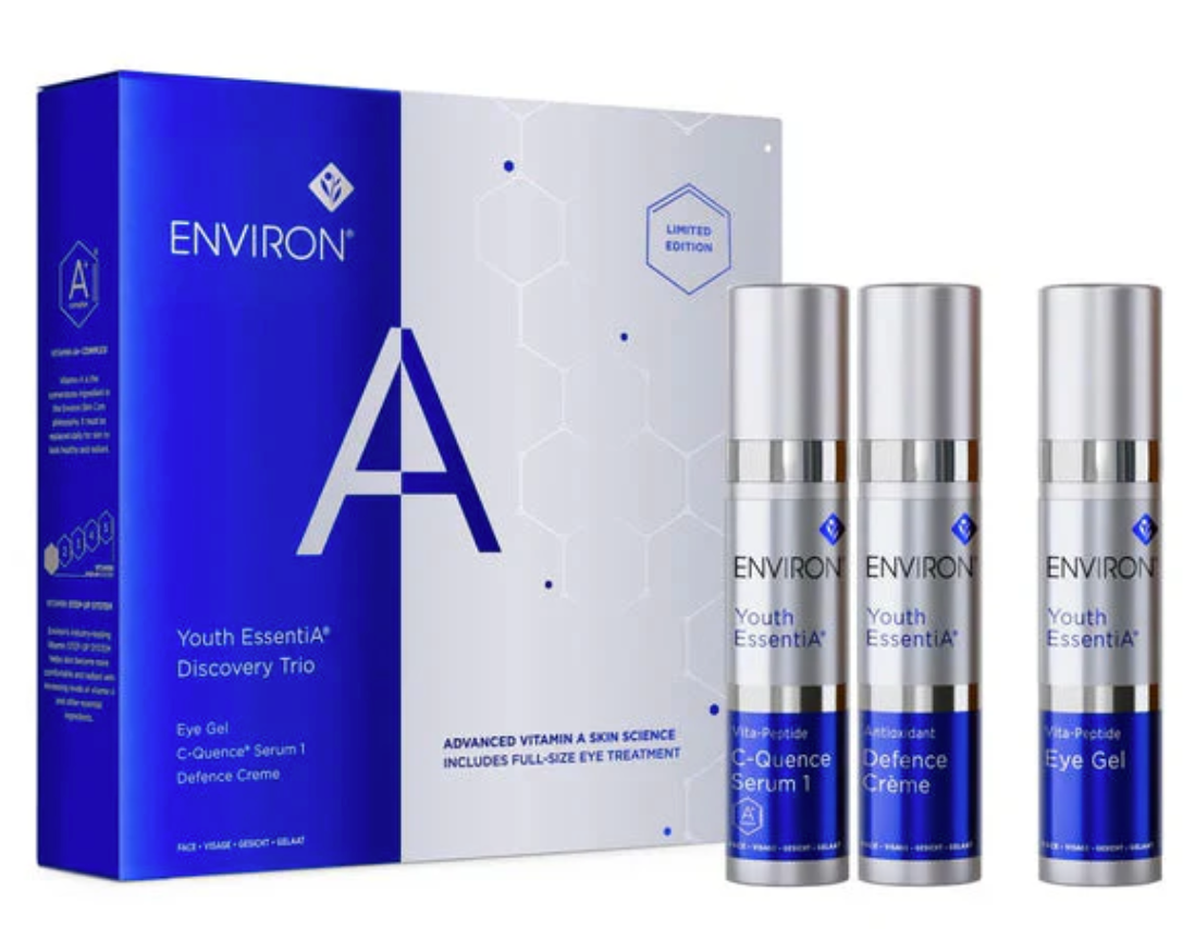 The Environ Youth Essentia Discovery Trio contains 3 daily essential products for face and eyes that help replenish your skin with a highly effective combination of powerful retinoids, antioxidants and peptides to visibly improve 9 signs of photo-aging.